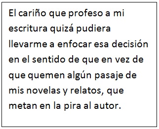 El cariño que profeso a mi escritura quizá pudiera llevarme a enfocar esa decisión en el sentido de que en vez de que quemen algún pasaje de mis novelas y relatos, que metan en la pira al autor.