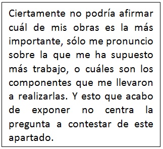 Ciertamente no podría afirmar cuál de mis obras es la más importante, sólo me pronuncio sobre la que me ha supuesto más trabajo, o cuáles son los componentes que me llevaron a realizarlas. Y esto que acabo de exponer no centra la pregunta a contestar de este apartado.